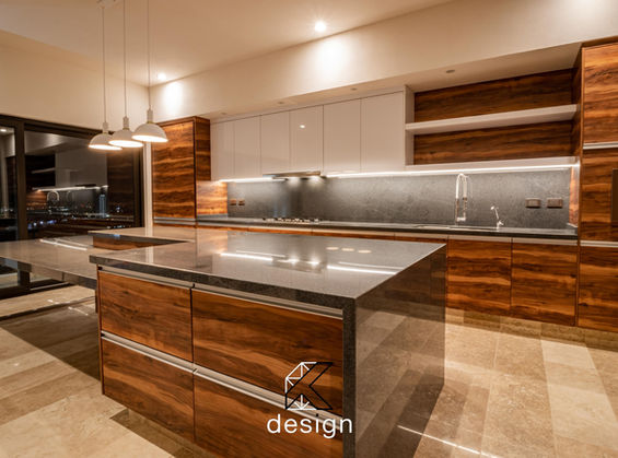 Diseñar un espacio grande que a la vez de la sensación de calidez y que combine con las demás áreas de tu casa. Siendo una cocina abierta, de tomó en cuenta los tonos de la carpintería ya instalada, también coordinar los puntos de luz decorativos así como también la luz funcional en áreas esenciales de trabajo.